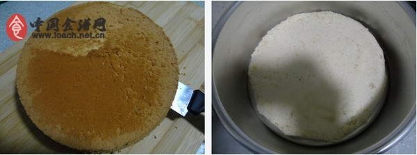 1、戚風(fēng)蛋糕裁下兩個(gè)約2CM厚的薄片,修剪一圈。一片比八寸活底模略小一點(diǎn),另一片再小一點(diǎn)。稍大的蛋糕片放到模具里。