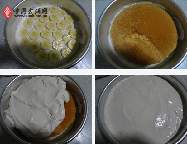 2、倒上一半慕斯餡晃勻。鋪上香蕉片,再放上稍小的蛋糕片。倒入剩下的慕斯餡,晃勻后,入冰箱冷藏1小時(shí)。