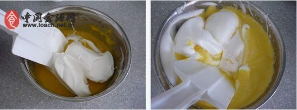 4、取三分之一的糖蛋白加入蛋黃糊中,上下翻動(dòng)拌勻后,全部倒到糖蛋白中,上下翻動(dòng)拌勻。