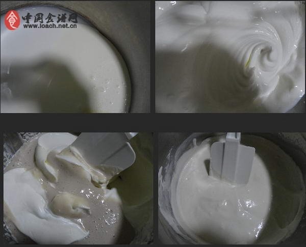 白醋打發(fā),分三次加入白糖,打至干性發(fā)泡,提起打蛋器糖蛋白呈直立小三角狀。