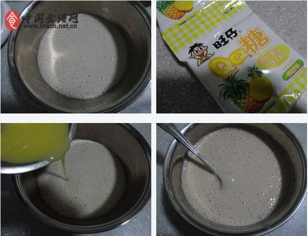1、牛奶160克加香蕉用料理機(jī)攪打成泥,牛奶80克加QQ糖,隔水融化,放涼后,加入香蕉泥中,攪勻。