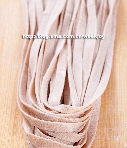 5.切好后撒點(diǎn)干面粉或者細(xì)玉米面防粘。煮面時(shí),手搟面好熟,所以煮兩個(gè)開鍋即可。一頓吃不完可以分成需要的分量裝袋直接冷凍。