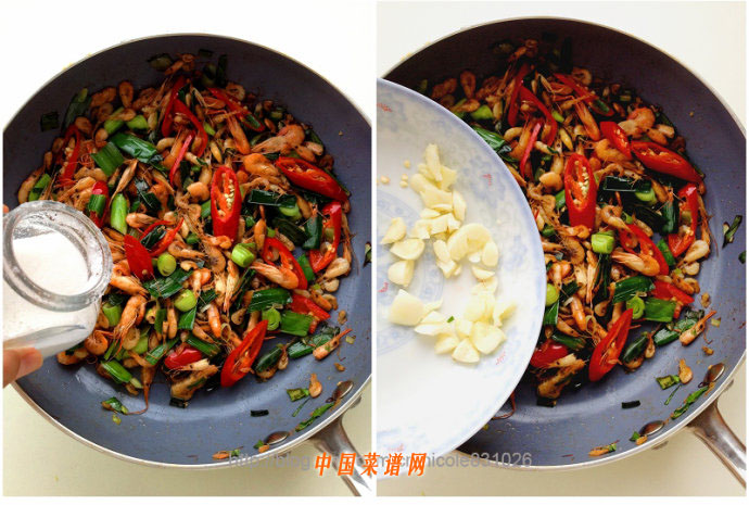 2. 炒至河蝦變色,放入青蒜和紅辣椒;