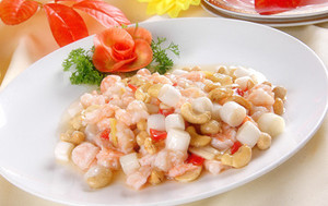 4、熱一鍋,放入油(份量外)、蒜末爆香后,放入作法2的青椒片、黃椒片略炒后,加入作法1的蝦仁、淋入作法3的調(diào)味料拌炒入味,再放入腰果拌炒一下即可。