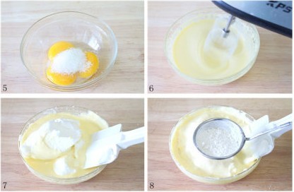 8.用刮刀將面粉,蛋白,蛋黃翻拌均勻。不要打圈攪拌以免蛋白消泡。重復剛才步驟,將剩下的蛋白、面粉也倒入碗里,拌勻成濃稠的面糊。這個時候的面糊應該是濃稠面糊,沒有大氣泡。