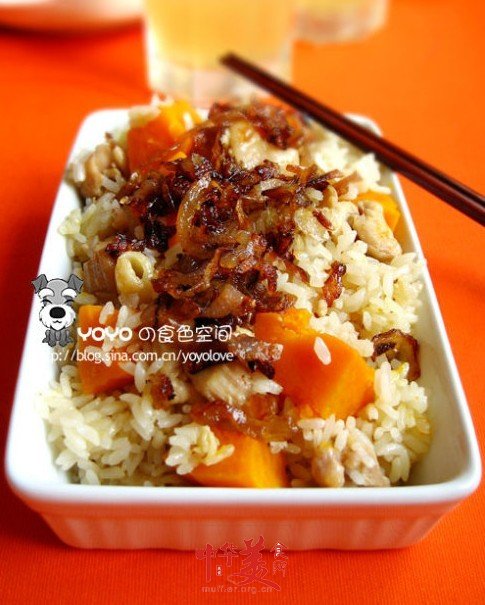 6、吃的時(shí)候,香滑軟糯的糯米雞南瓜飯,拌上酥脆咸美的紅蔥酥,好吃的沒話說。