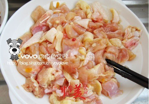 2、雞腿肉切塊,加1勺