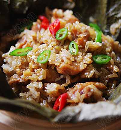 荷葉用清水泡兩小時后仔細用干凈的布擦干凈。留著備用。如果不放心衛(wèi)生問題也可以在開水里燙一下。但一定要快速,燙久了也會去掉荷葉的清香的。(如果在家,用的是新鮮的荷葉。。該是多香啊。。 )