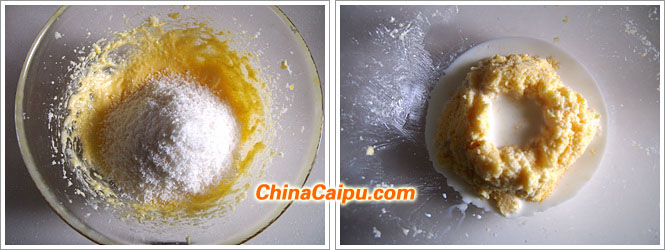 3、加入椰蓉拌勻,攪拌全部濕潤即可。