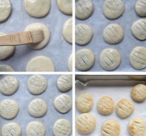 9,收口向下并搟成圓餅型,放入烤盤中表面刷蛋液。