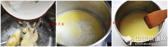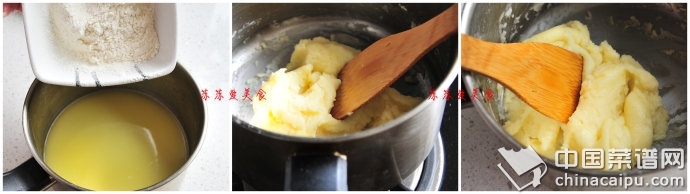 1、先將低粉過篩備用,再將黃油、鹽、水放入小鍋里,中火加熱至沸騰。
