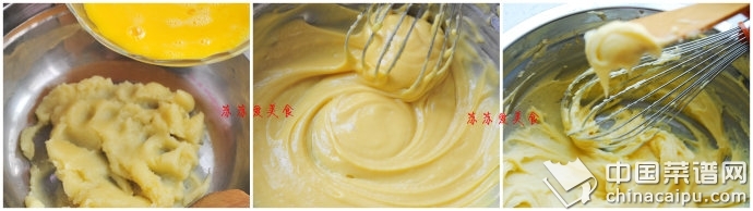 6、最后面團(tuán)糊用木勺舀起,面糊呈倒三角形不滴落。