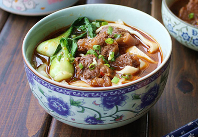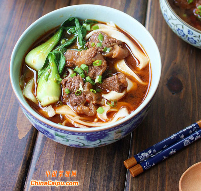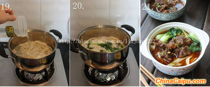 21.將煮好的面條與青菜放入碗中,放入燒好的牛腩及牛腩湯,撒上蔥花,即可食用;