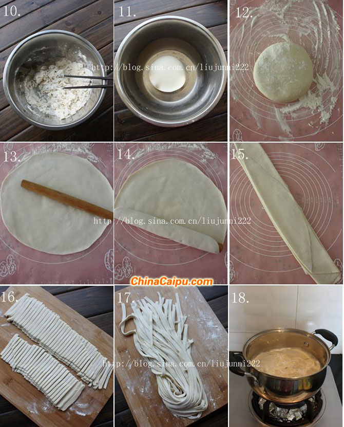 18.湯鍋內(nèi)放入適量的水,燒開,下入手搟面;