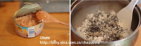 10.開金槍魚罐頭,因為成塊,用勺子搗成泥,備用
