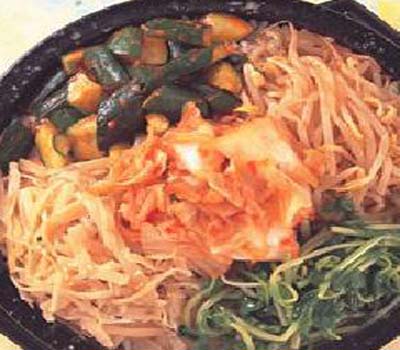 4.將作法1放入作法2的石鍋碗內(nèi)后,再依序加入辣味牛蒡絲、辣醬小黃瓜、
