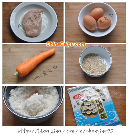 1、 取一張紫菜,鋪在竹簾上,均勻鋪上米飯,在一側(cè)放上雞肉條、胡蘿卜條、蛋皮條
