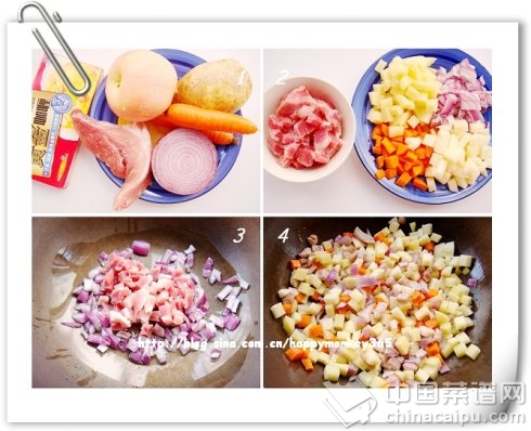 3.4. 鍋中加適量油,下瘦肉丁和洋蔥丁翻炒,至肉變色洋蔥煸出香味時,下入蘋果丁土豆丁胡蘿卜丁一起翻炒2分鐘;