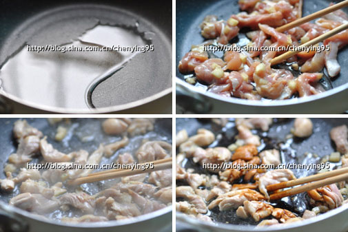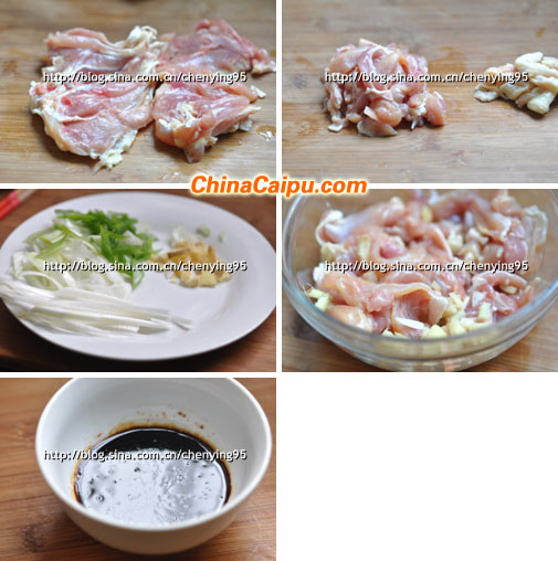 5、 雞肉切小長條,放老姜、料酒腌制一會會