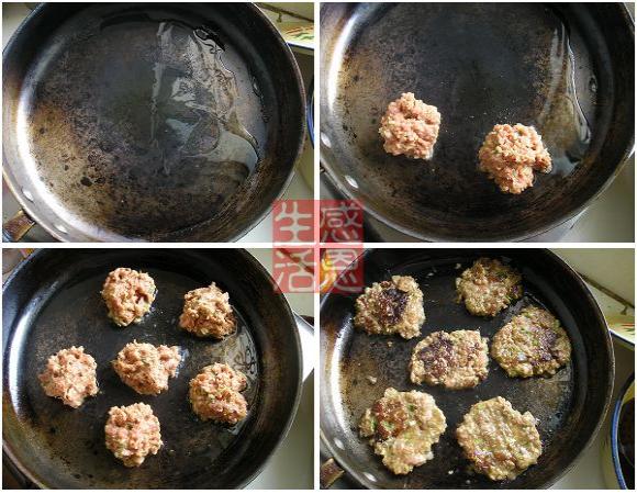 平底鍋放油,燒至溫?zé)帷?br data-Qr1w="immnSd">6.將攪拌好的肉餡團(tuán)成團(tuán)放入鍋內(nèi)。