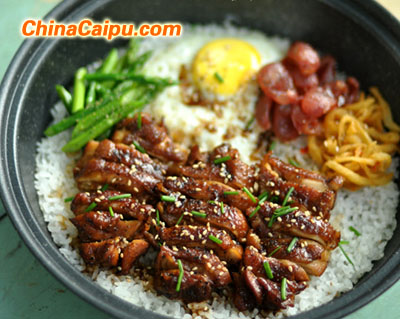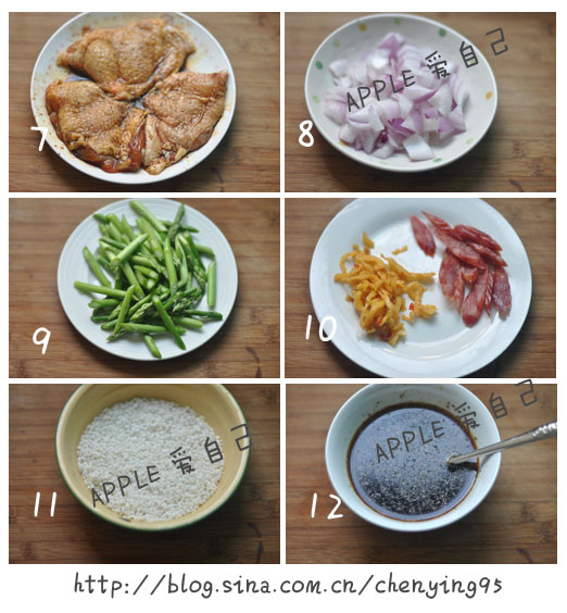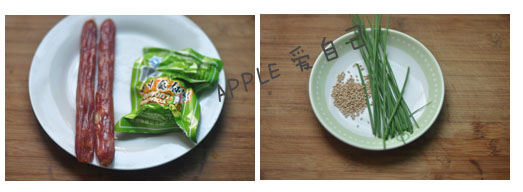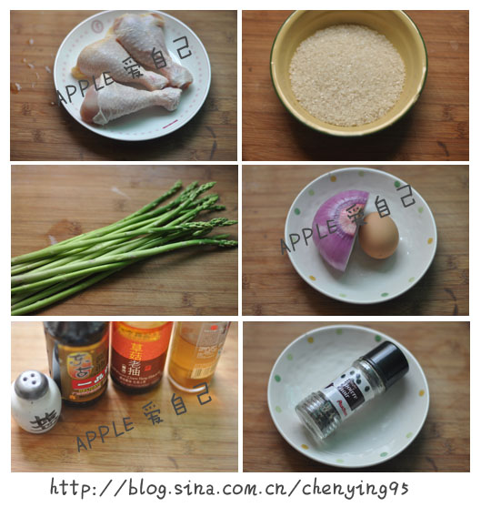 一、材料:琵琶腿、大米(150克)、洋蔥、雞蛋、香腸、蘿卜干、蘆筍、