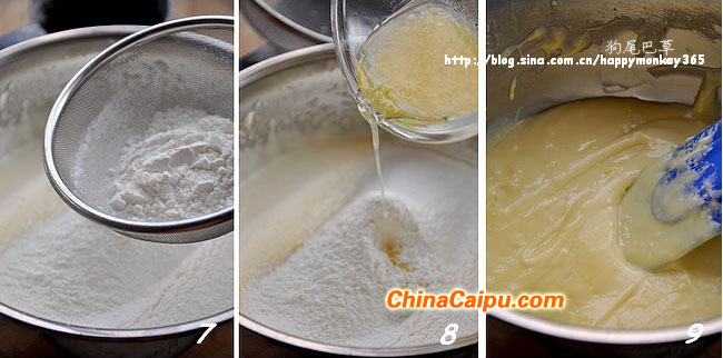 8.9.倒入步驟3小碗中的混合液體。用橡皮刮刀刮拌均勻。
