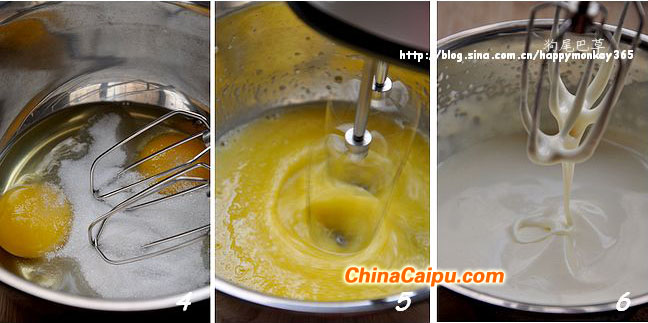 4.5.雞蛋磕入盆中,加入細(xì)砂糖,用電動打蛋器攪打。打蛋器先慢速,再快速。
