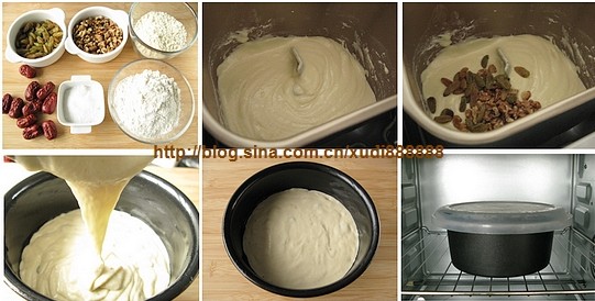 3 加水混合攪拌成稍具流動(dòng)性的面糊,加入大部分分量的葡萄干和核桃仁拌勻;