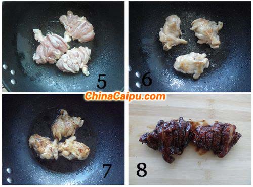 5 鍋里放少量油,油熱后放入雞腿,雞皮朝下慢慢煎