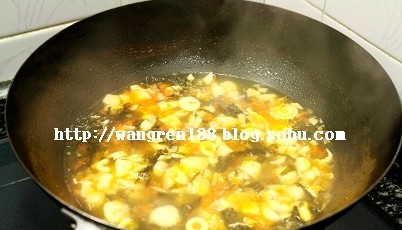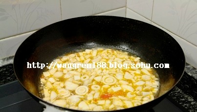 1、鍋中油熱后,放入蒜碎煸香,倒入西紅柿煸軟