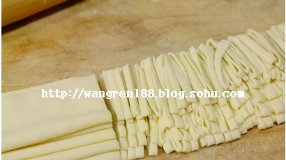 4、活好的面搟成大片,折疊后切成面條