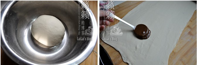 1-2.將酵母在溫水中化開,靜置3、5分鐘;徐徐倒入面粉盆中,邊倒邊用筷子將面粉攪拌成雪花片狀,再搓揉成光滑面團(tuán);案臺上撒上手粉,將面團(tuán)用搟面仗搟成長方形面片,芝麻醬加入糖、鹽混合均勻,涂抹在面片上;