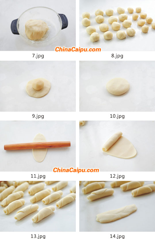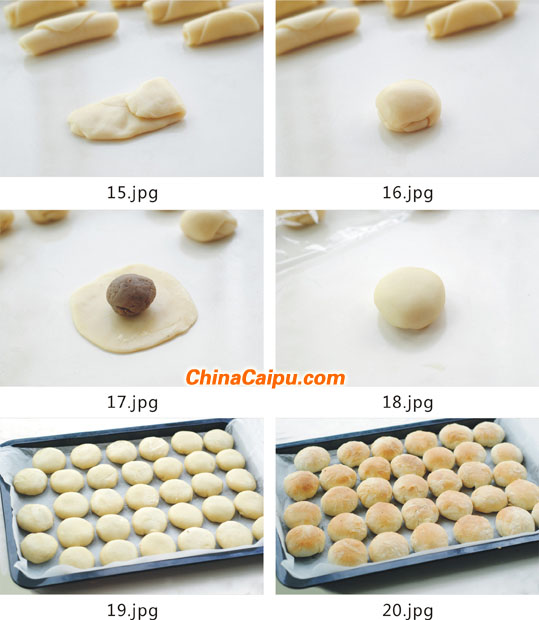 8、將油皮、油酥分別分成20g及14g的小份,滾圓。