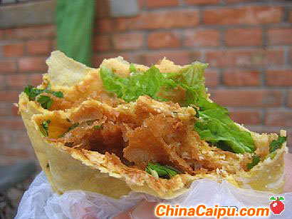 煎餅當(dāng)早飯賣,但那些著實(shí)不夠正宗。煎餅因其脆、香、薄而聞名。蒲松齡也是一個(gè)愛吃煎餅的人,專門寫了一篇<煎餅賦>,其中一句:“圓如望月,大如銅鉦,薄似剡溪之紙,色似黃鶴之翎,此煎餅之定制也?!本褪沁@樣了,蒲松齡專門為煎餅寫斌,可見有多喜愛。