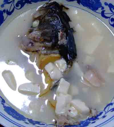 魚(yú)頭豆腐湯原料:草魚(yú)頭1個(gè),豆腐1塊,