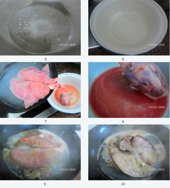 15、將豬肺用清水過幾遍,直到豬肺表面的浮沫全部洗凈