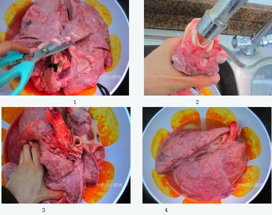 1、第一步拍打和擠壓豬肺的過程重復(fù)兩到三次就可以了,可以不用洗到發(fā)白,因?yàn)檫€有后面的兩步處理完全可以將豬肺處理干凈。