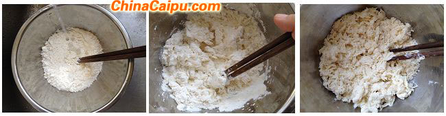 2、取適量面粉放入大盆中,加入自來水,注意控制水流,邊加邊快速攪拌,成偏干的雪花狀即可。