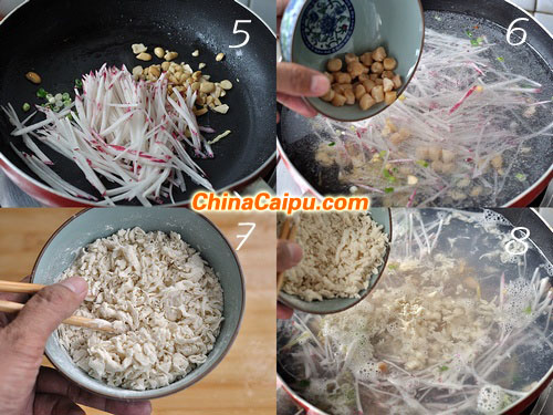 8、鍋里水開后,倒入打好的面碎,邊倒邊用勺子攪動,防止黏連。水開后加精鹽,改小火煮5分鐘即可,出鍋前可滴入香油,撒入