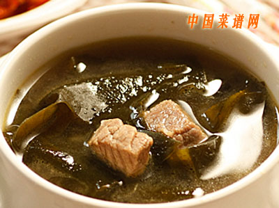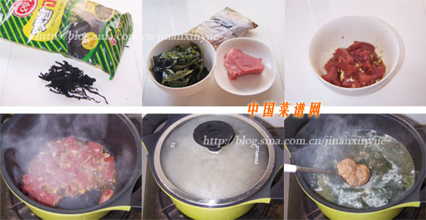 1、取一片干的韓國海帶,用清水泡發(fā);(下圖中韓國海帶與中國海帶不同,一片就成泡出一小碗,份量不宜過多)