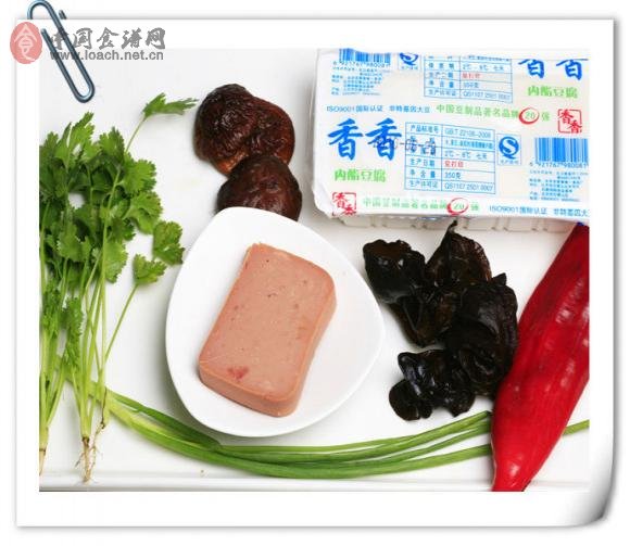 7、鍋置火上,倒入高湯,沒有高湯就用清水代替,燒開后先放入豆腐略煮一下,然后放入香菇絲,火腿絲,木耳絲,