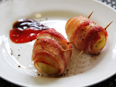2.撈出瀝水,涼至不燙手后剝?nèi)ネ馄溆?br data-aIDb="yxrTCe">3.培根裁到適合土豆的寬度,卷在土豆上面
