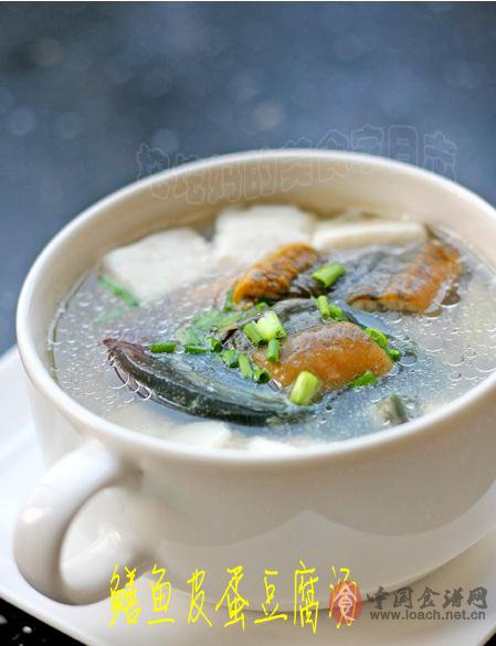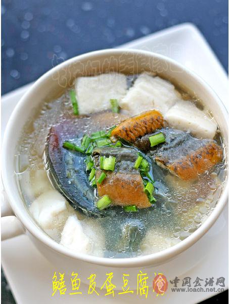 1.皮蛋兩個(gè)切瓣,大鱔魚兩條去骨去腸洗凈,改刀成片,加少量鹽、料酒、生粉、蛋清拌勻,內(nèi)脂豆腐半盒切成小塊,生