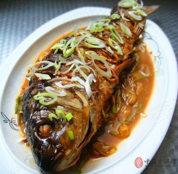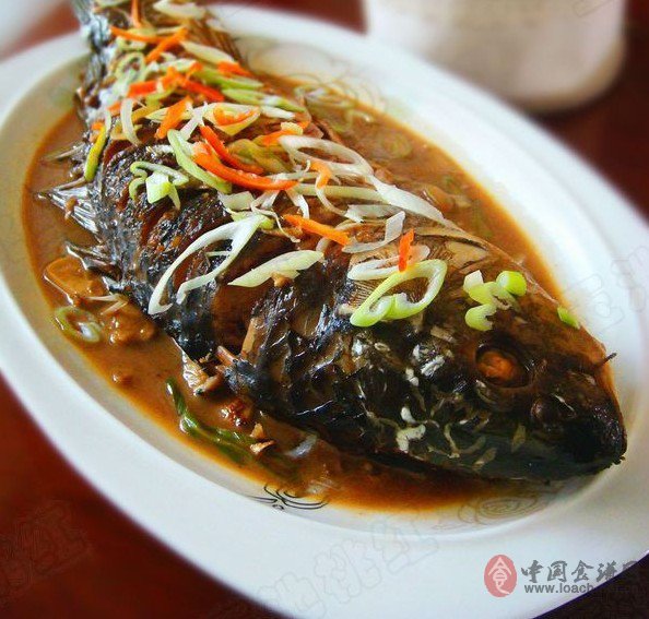 7、放入煎好的魚,大火燒開后,轉(zhuǎn)小火燜至15~20分鐘,把湯汁收干,撒入一些蔥絲即可。哈哈,為了好看,端上餐桌時,俺又撒了點紅椒絲裝飾了一下。
