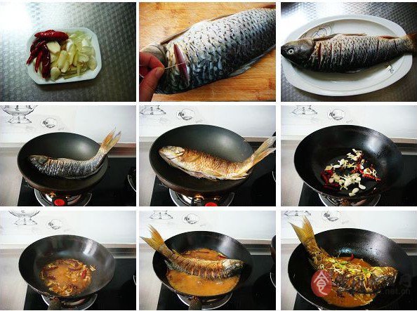 2、鯉魚一條,去鱗、去內(nèi)臟清洗干凈。在頭和尾部的位置各切一刀,兩面相同,剔除魚腥線,用手指甲捏住,往外抽動,去除醒線。