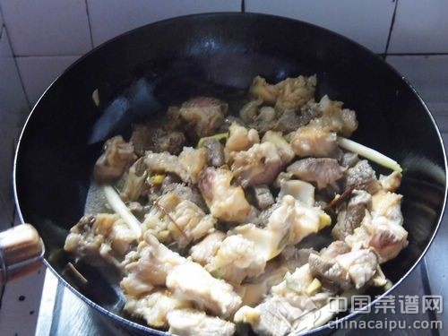 7.倒入牛肉翻炒,加入2勺生抽和1勺白酒翻炒均勻后,倒入足量開水燒開撇去浮沫(切記一定是開水)