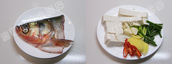 準備工作:魚頭先用料酒,細鹽涂抹腌制10分鐘。豆腐切小方塊、大蒜用刀拍裂、香蔥切段、姜切片、