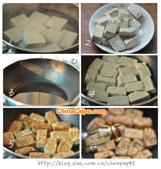 1、豆腐用的是老豆腐,先過水焯下,可以去豆腥味哈