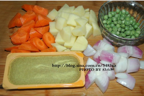 胡蘿卜去皮洗凈切塊。洋蔥一部份切塊,另一部份切碎末。