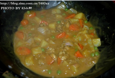 7.關火或是把火轉到最小,加入咖喱塊,用鍋鏟攪至咖喱完全融化